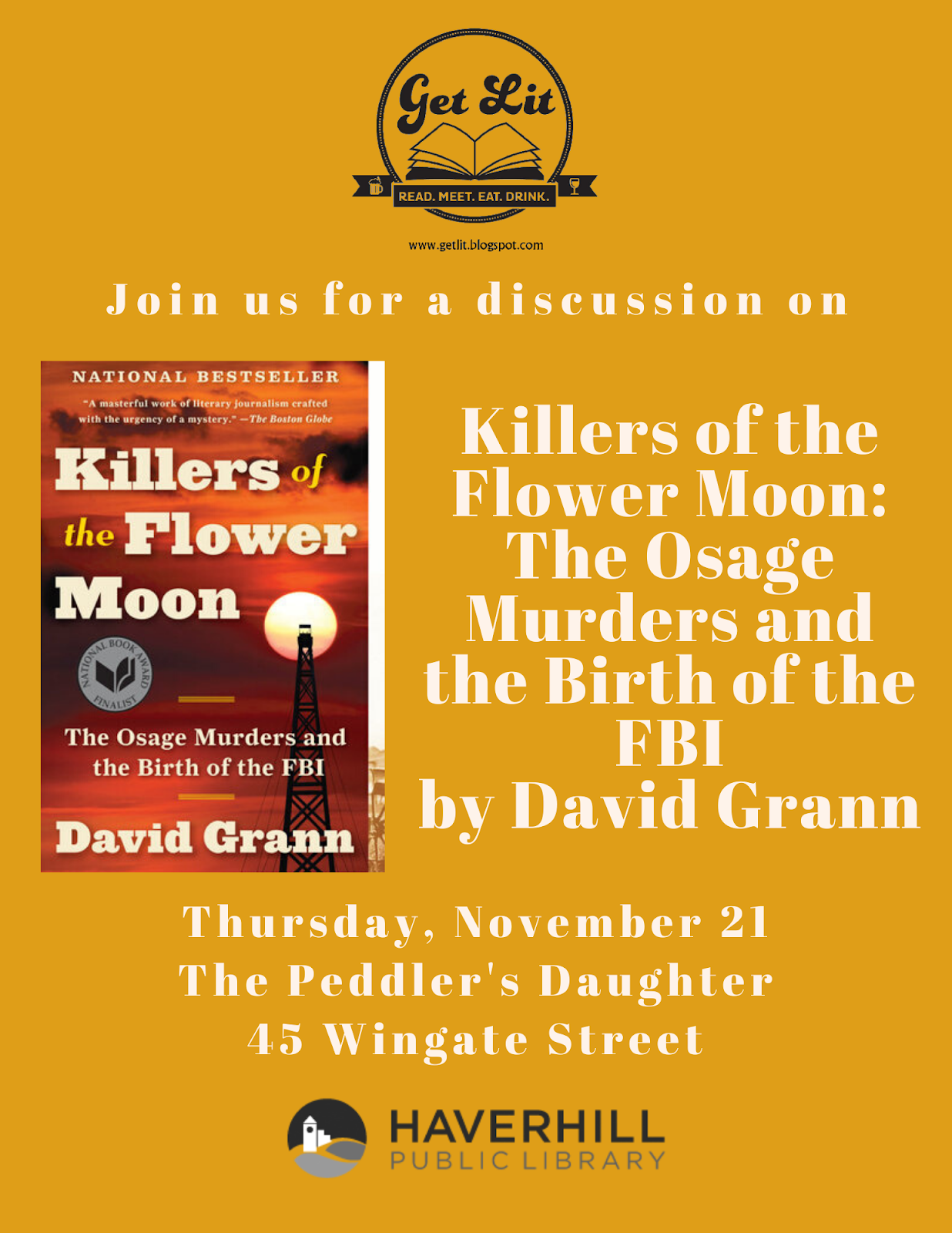 Join us on Thursday, November 21 at The Peddler's Daughter for Get Lit! We'll be meeting at 7:00 PM to discuss Killers of the Flower Moon: The Osage Murders and the Birth of the FBI by David Grann. This book documents the murders of Osage Indian Nation members and the FBI's role in the investigations.